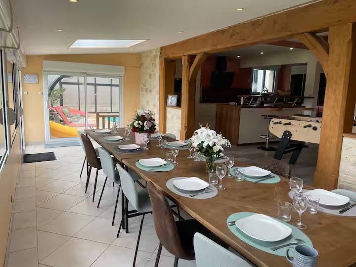Grande cuisine toute équipée : four, bouilloire, micro-onde, lave vaisselle, machine a café, presse agrume, grille pain, appareil à raclette, appareil à fondu, appareil à crêpe ...